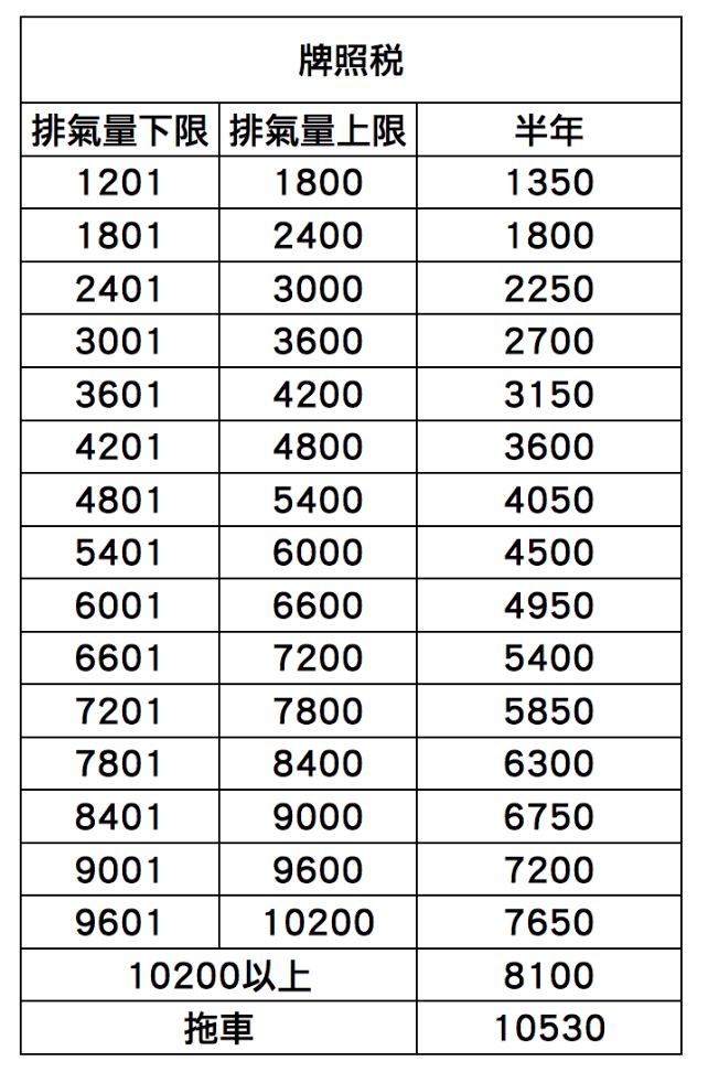 每年徵收兩次,分上半年,下半年兩期徵收 ( 4月, 10月 ) ,金額視 車輛引擎排氣量 (cc數 ) 大小而定,可參考下方表格查詢。舉例,如排氣量為 7545 cc ,查表可得知因位於 7201 cc – 7800 cc 區間,故每期(每半年) 須繳金額為 5850 元,每年牌照稅總繳金額為 5850 * 2 = 11700 元。