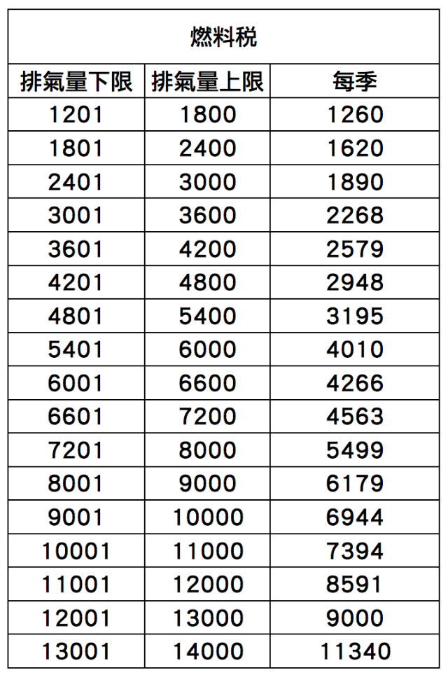 於每季 ( 3月, 6月, 9月, 12月 ) 徵收一次 ,一年共徵收 4 次,金額視 車輛引擎排氣量 (cc數) 大小而定,可參考下方表格查詢 。舉例,如排氣量為 7545 cc ,查下表可知因其位於 7201 cc – 8000 cc 區間,故每季 (每3個月) 須繳金額為 5499 元,每年總共需繳納燃料稅金額為 5499 * 4 = 21996 元。
